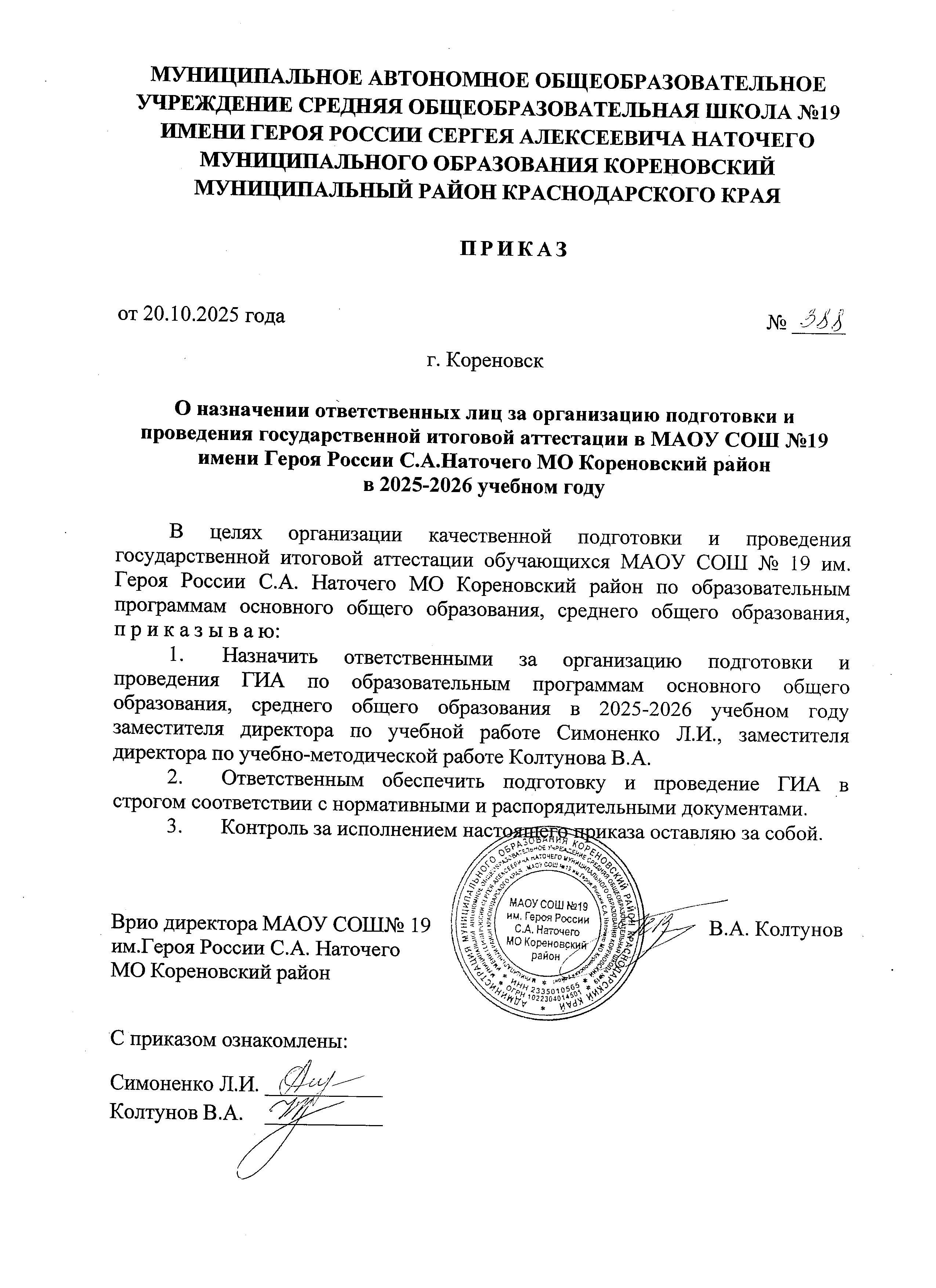Приказ о назначении ответственного за организацию подготовки и проведения ГИА приказ № 388 от 20.10.2025г.